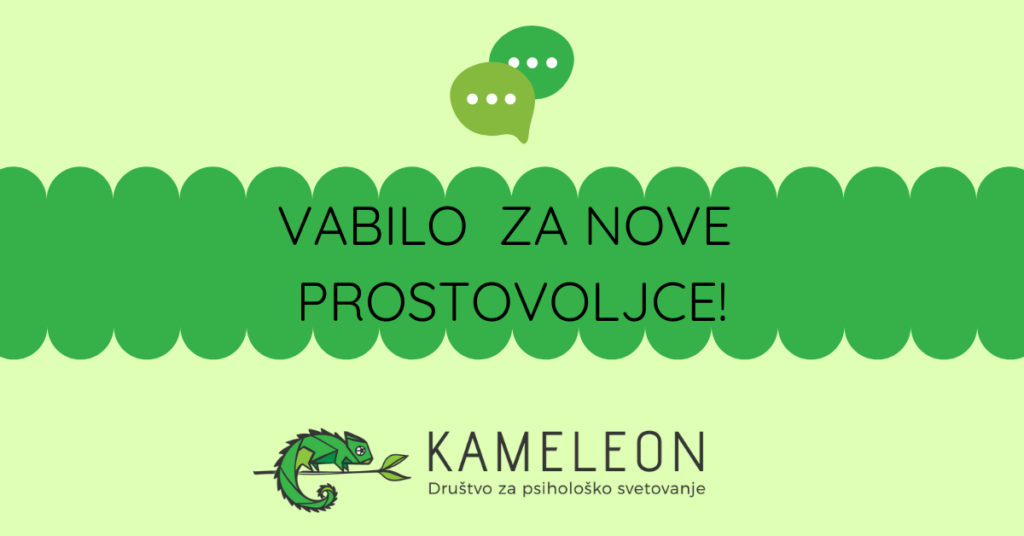 Pozdravljeni! Pri Društvu za psihološko svetovanje Kameleon iščemo nove prostovoljke svetovalke, študentke podiplomske stopnje psihologije in biopsihologije ali psihologinje s končanim magisterijem. Besedilo je za lažjo berljivost napisano v ženski obliki, vabljeni seveda vsi. PREDSTAVITEV Društvo za psihološko svetovanje Kameleon je prostovoljno, izobraževalno in nepridobitno združenje, ki se ukvarja s spletnim psihološkim svetovanjem in ozaveščanjem […]